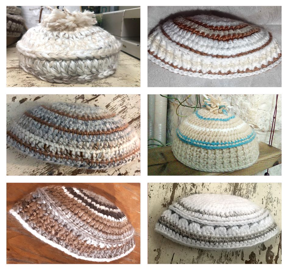כיפות מצמר, כותנה, וחוטים משולבים – כל כיפה נסרגת באהבה וביד אמן. דוגמאות מגוונות, צבעים חמים, וחיבור אמיתי לחומר.